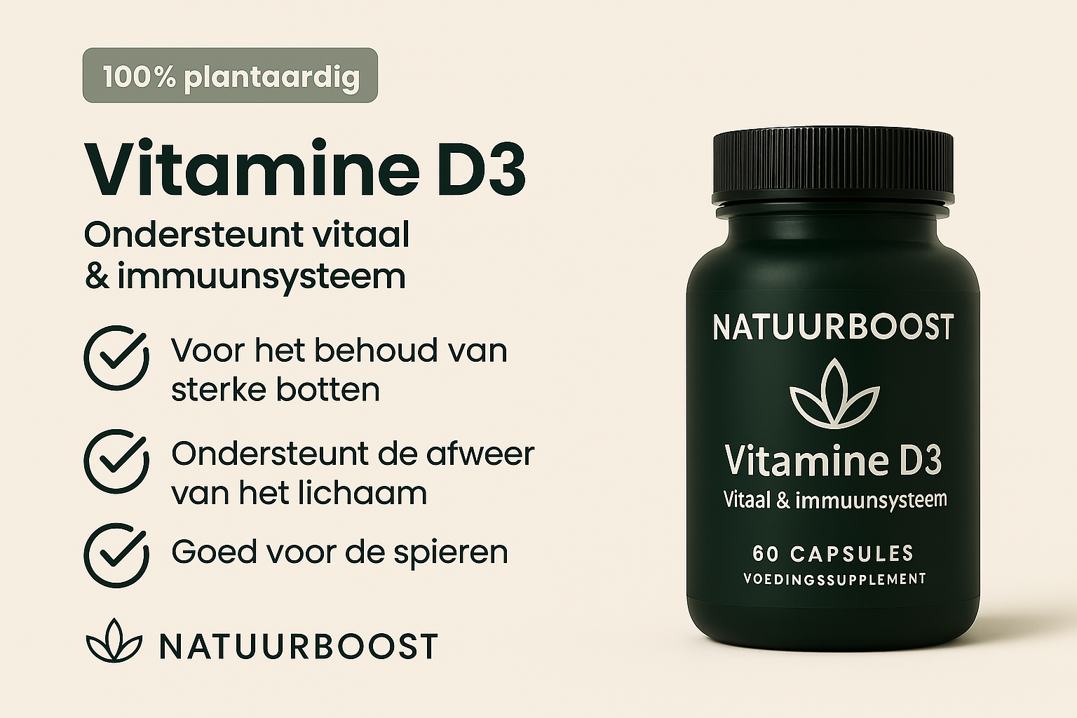 Veel mensen kampen – vaak ongemerkt – met een tekort aan vitamine D, vooral in de herfst en winter of bij een binnenlevend bestaan. Natuurboost Vitamine D3-capsules geven je die onmisbare 'zonneschijnvitamine' die je lichaam nodig heeft.